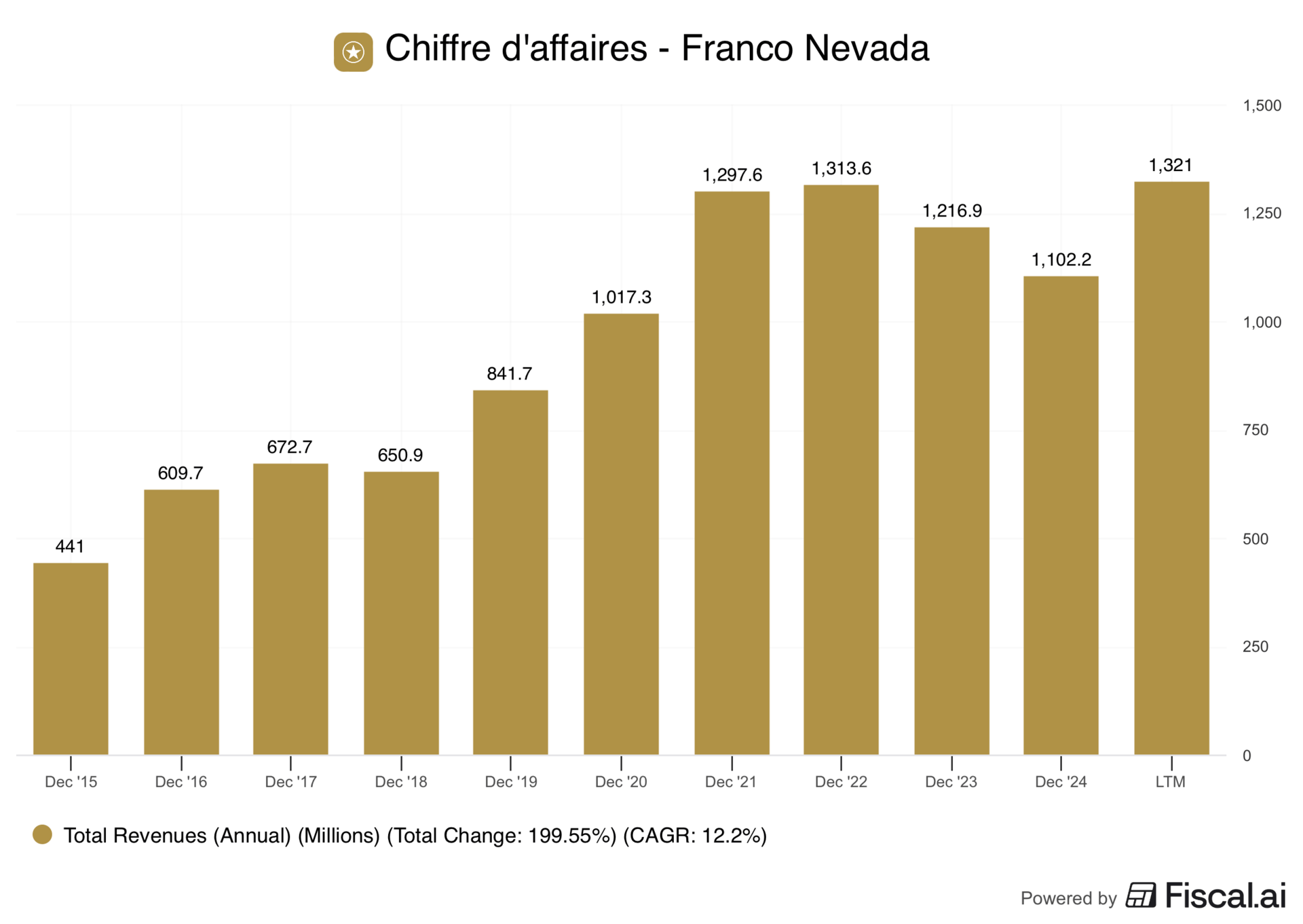 Royalties : Franco-Nevada finance des projets miniers et reçoit un pourcentage des revenus de la production d’or, sans assumer les coûts opérationnels (extraction, main-d’œuvre, entretien). Cela lui permet de profiter de la hausse des prix de l’or tout en limitant les risques liés aux aléas opérationnels (pannes, grèves, enjeux environnementaux).