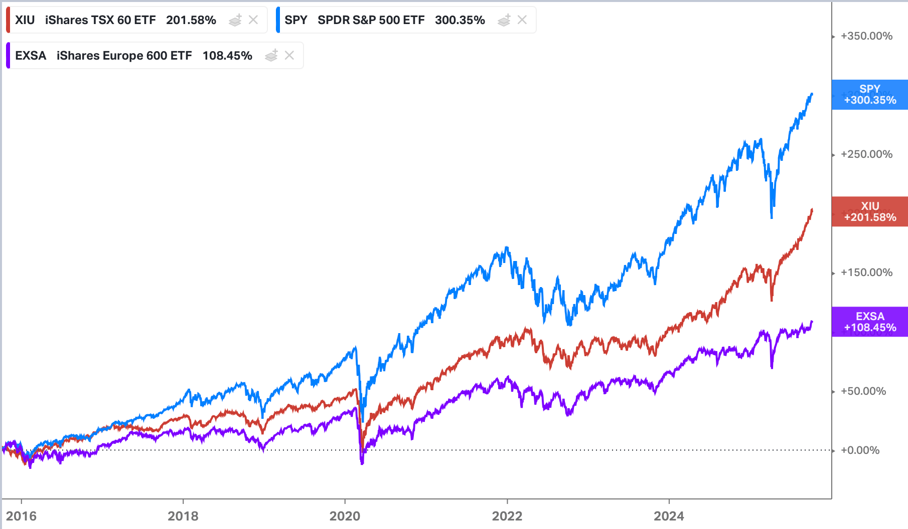 Pour illustrer ce dynamisme, il suffit de comparer les indices : sur les 10 dernières années, le S&P/TSX 60 a délivré un rendement cumulé qui dépasse du simple au double celui du Stoxx 600 👇
