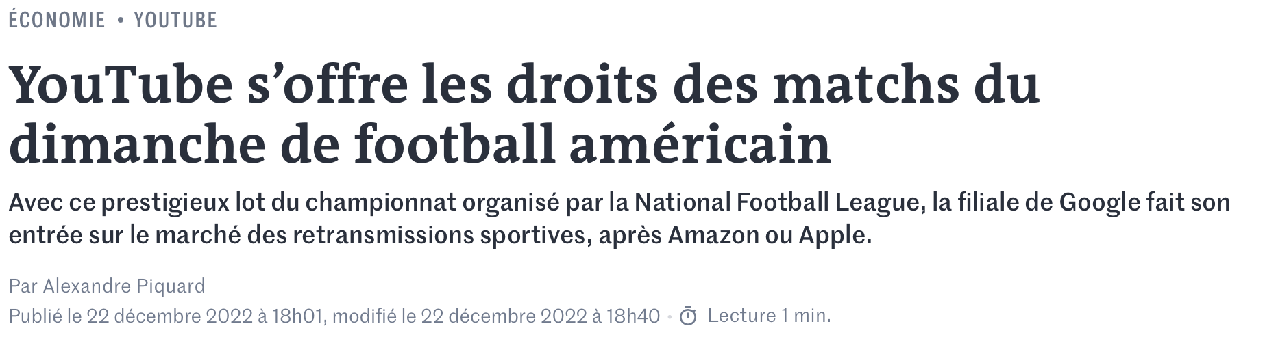 Comme de nombreuses entreprises comme Amazon, Netflix ou Apple qui acquièrent des événements sportifs (Formule 1, Roland-Garros, MLS..) YouTube pourrait aussi accélérer sur l’acquisition de droits sportifs de diffusion. Pour le moment, cela très concentré sur les Etats-Unis, mais on a peu de doute qu’ils pourraient accélérer sur le Vieux Continent.