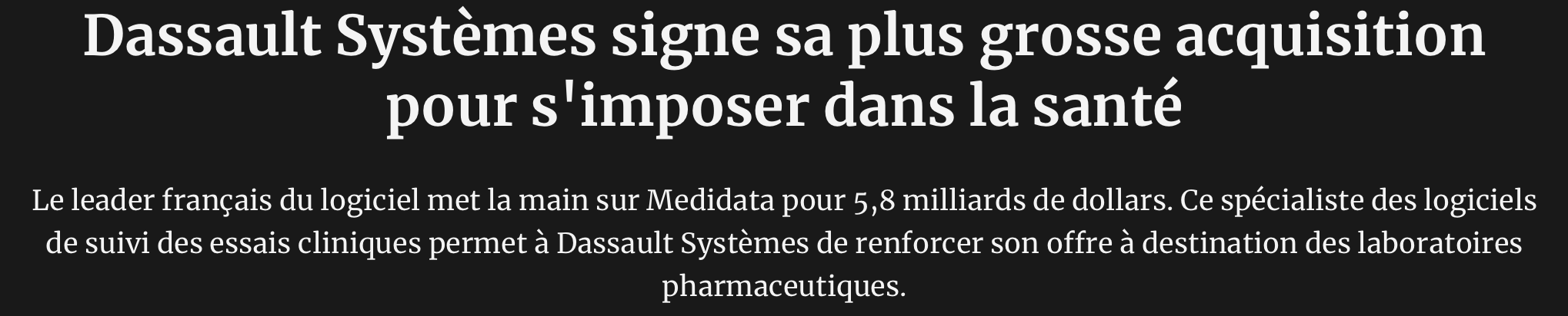 Si Dassault Systèmes a longtemps été perçu comme le leader des solutions logicielles à destination de l’industrie lourde, le groupe a tenté en 2019 le pari le plus ambitieux de son histoire avec le rachat de Medidata Solutions pour 5,8 milliards de dollars.