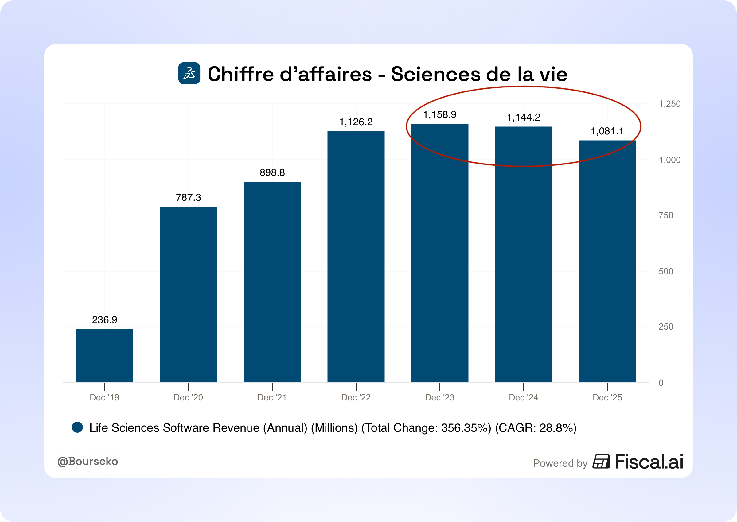 Enfin, il y a un sujet plus structurel. Nous estimons que Dassault Systèmes dispose d’un avantage compétitif solide pour vendre des logiciels de conception (CAO) à des ingénieurs dans l’automobile ou l’aéronautique. En revanche, vendre une plateforme de gestion de données cliniques à des acteurs comme Pfizer ou Sanofi repose sur une logique complètement différente.