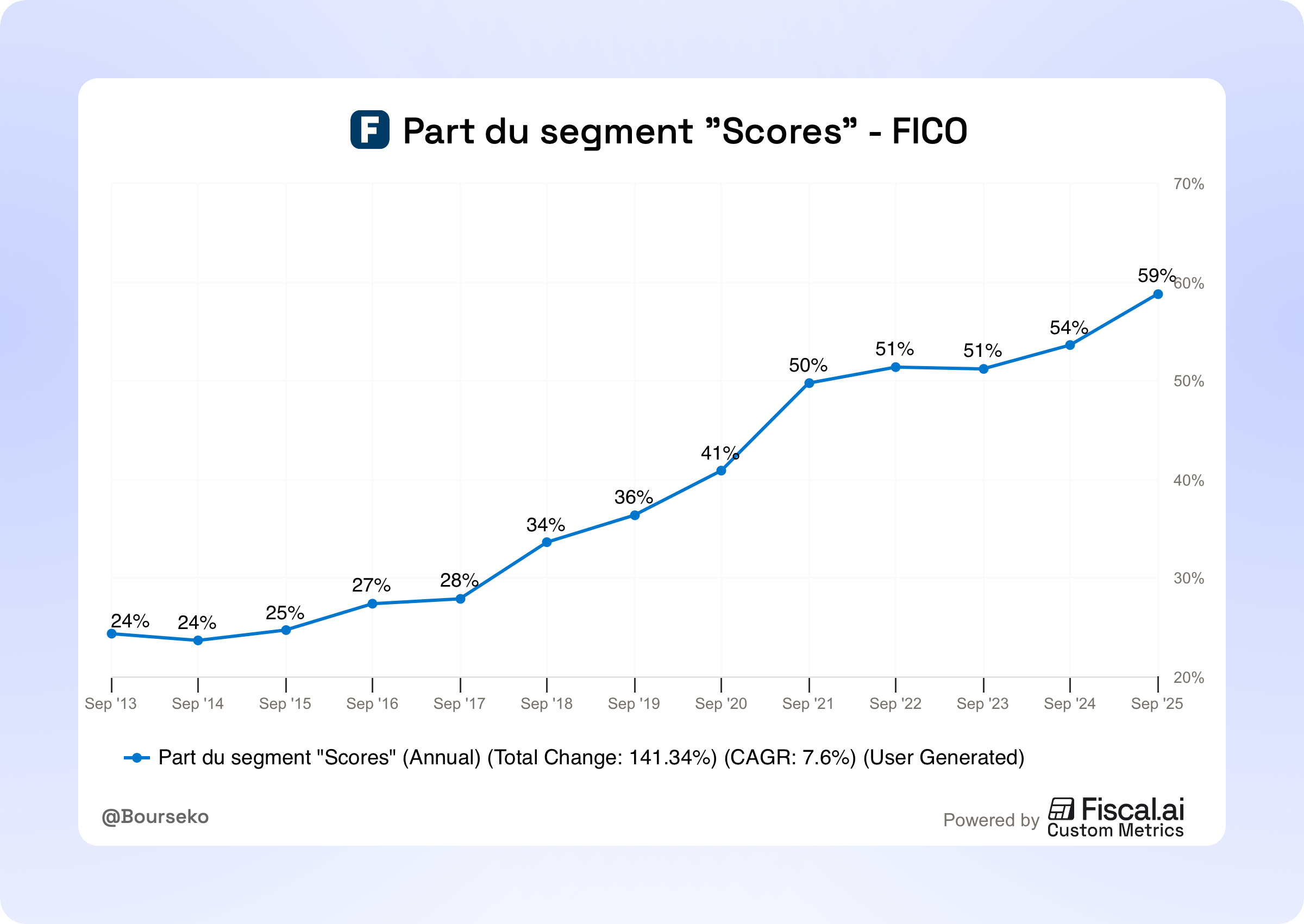 Le modèle économique de FICO dans cette activité est relativement simple. Chaque utilisation de son score est facturée. Le chiffre d’affaires dépend donc du nombre de crédits accordés, multiplié par un prix moyen. Si la croissance est en partie liée à une hausse du volume de crédits, elle s’explique surtout par une augmentation significative des prix depuis 2018. Et FICO peut se le permettre, car l’entreprise bénéficie d’une position quasi monopolistique sur ce marché.