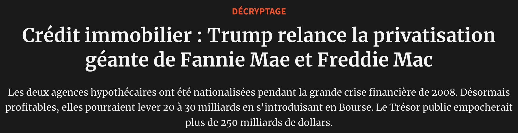 Lors de la crise des subprimes en 2008, l’effondrement des prix de l’immobilier a entraîné des pertes massives pour ces deux entités, qui garantissaient des millions de prêts toxiques. Pour éviter un effondrement du système financier mondial, le gouvernement américain a dû les renflouer.
