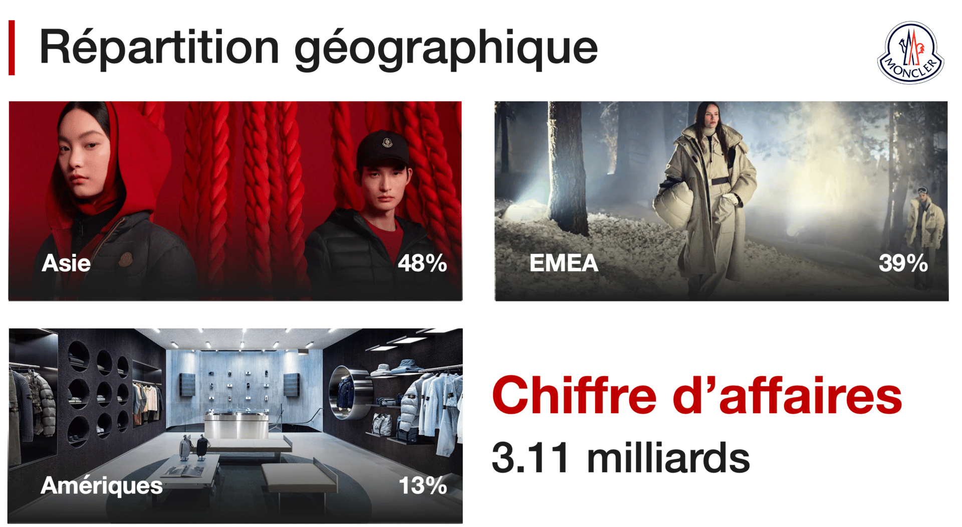 L'activité du groupe Moncler repose sur un équilibre géographique stratégique, bien qu'elle reste, à l'image des grands noms du luxe, très dépendante du dynamisme asiatique qui représente près de 48 % de son chiffre d'affaires global.