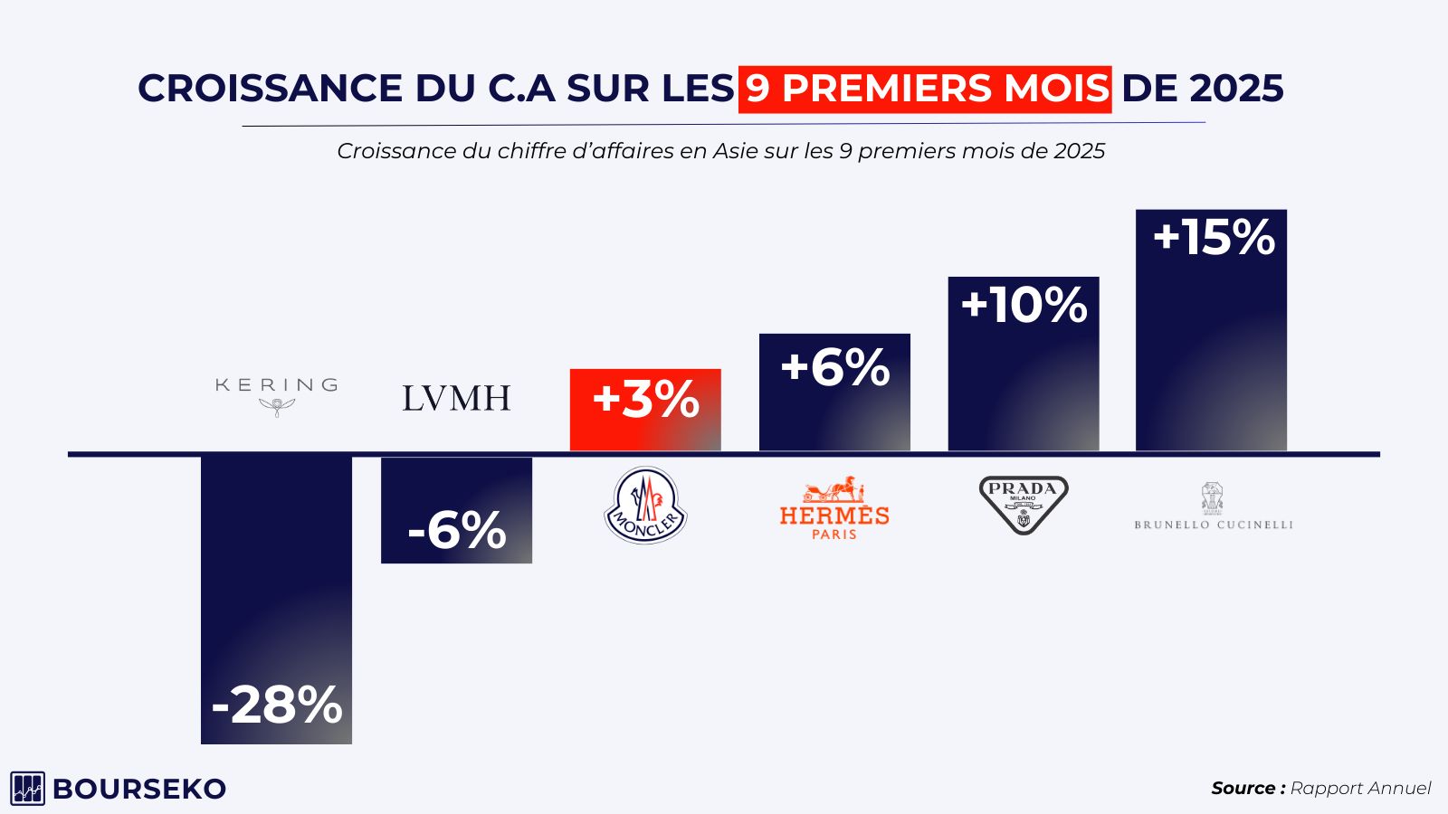En effet, alors que l’ensemble du secteur subit un net ralentissement, Moncler parvient à mieux résister que la majorité de ses pairs. Si les acteurs du quiet luxury comme Hermès ou Brunello Cucinelli restent les références en matière de solidité, Moncler se positionne juste derrière.