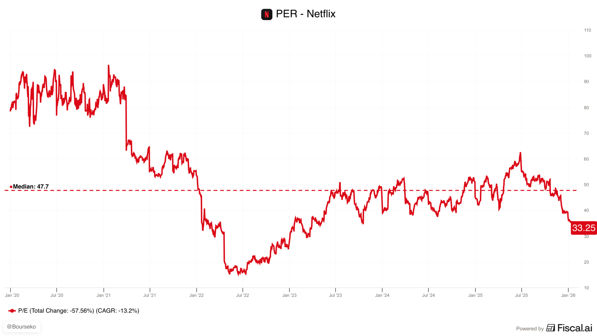 Depuis l’annonce en décembre de la potentielle acquisition de Warner Bros Discovery par Netflix, l’action du géant du streaming traverse une période mouvementée. Hier, après la publication des résultats du T4 2025, le titre a encore reculé, alors même qu’il a déjà perdu plus de 35 % par rapport à ses plus hauts.