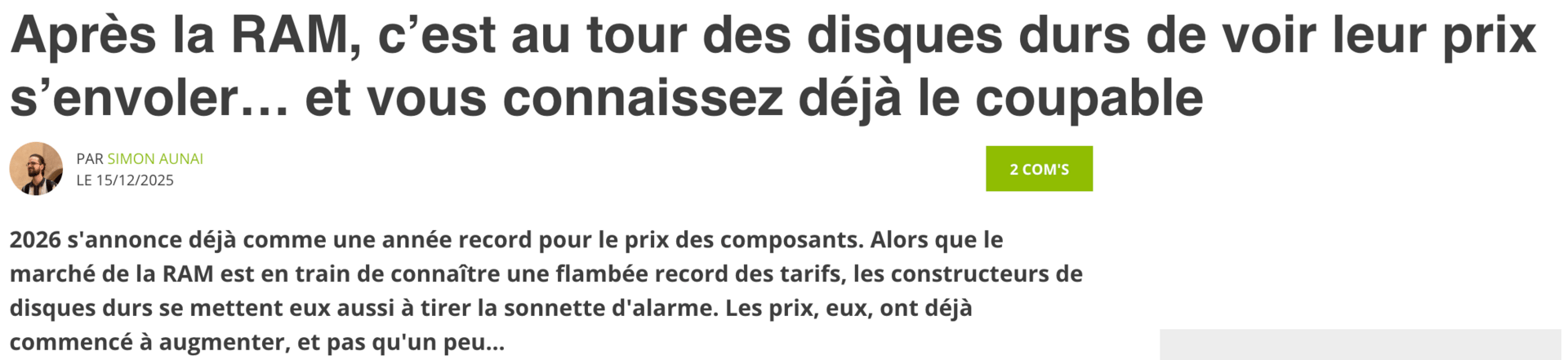 Ce rééquilibrage de l’offre a des effets très concrets. Alors que la demande globale de mémoire reste relativement stable, la capacité de production disponible sur les segments traditionnels s’est fortement contractée. Par conséquent, les prix ont fortement augmenté pour équilibrer le marché. C’est d’ailleurs un phénomène que l’on peut observer en tant que particuliers, avec l’explosion des prix des disques durs et des SSD.