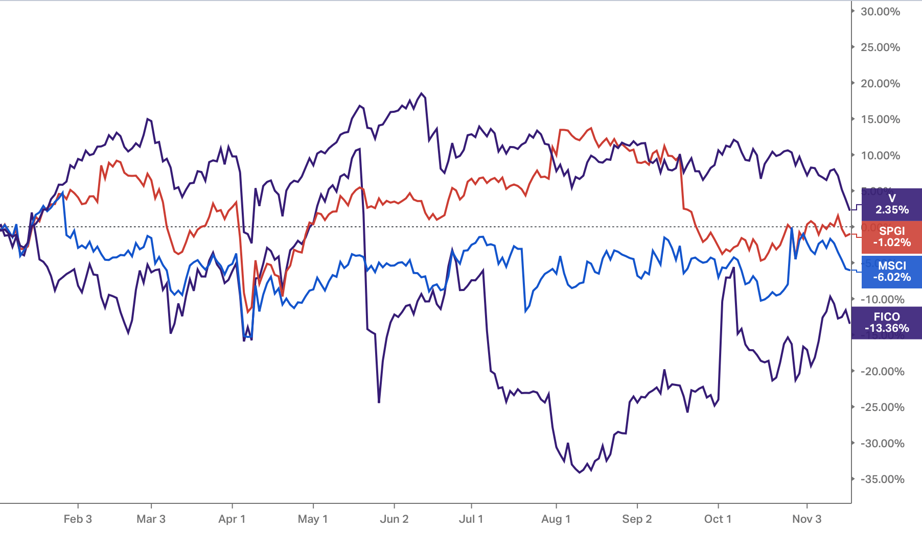 En analysant le portefeuille de Valley Forge, un constat s'impose : sur 9 positions, 8 appartiennent au sens large au secteur financier (incluant FICO, S&P Global, Mastercard, Moody’s, Visa, Equifax et MSCI).