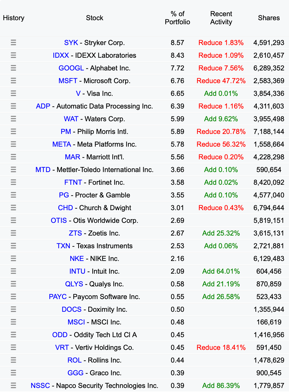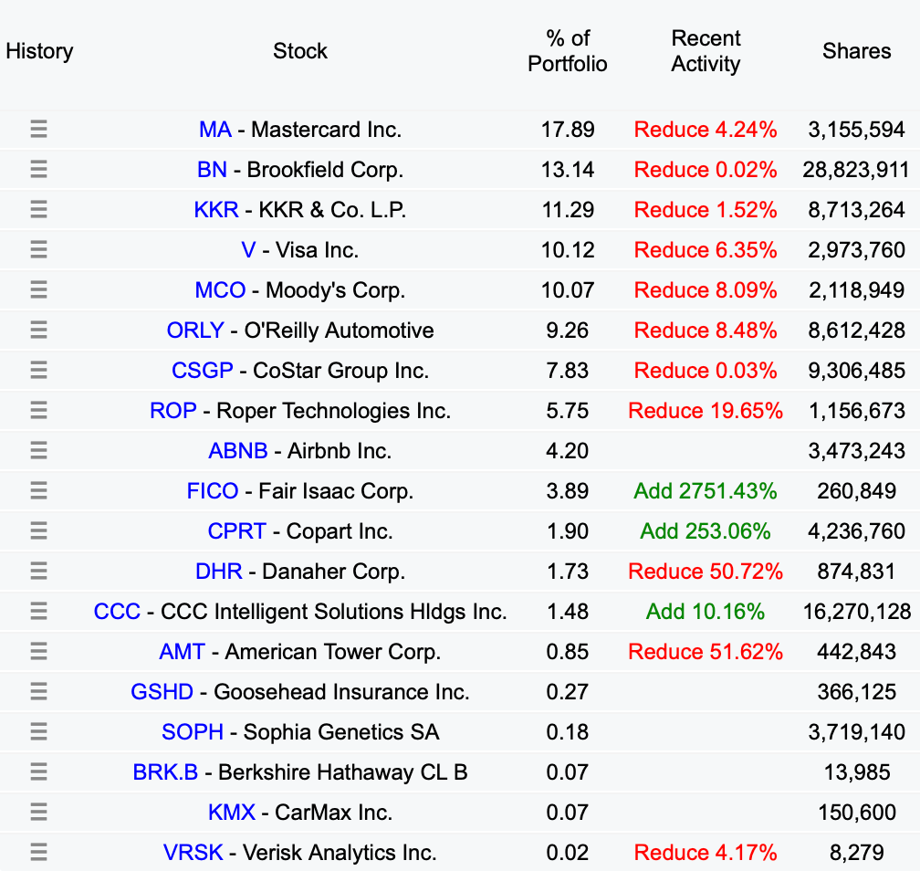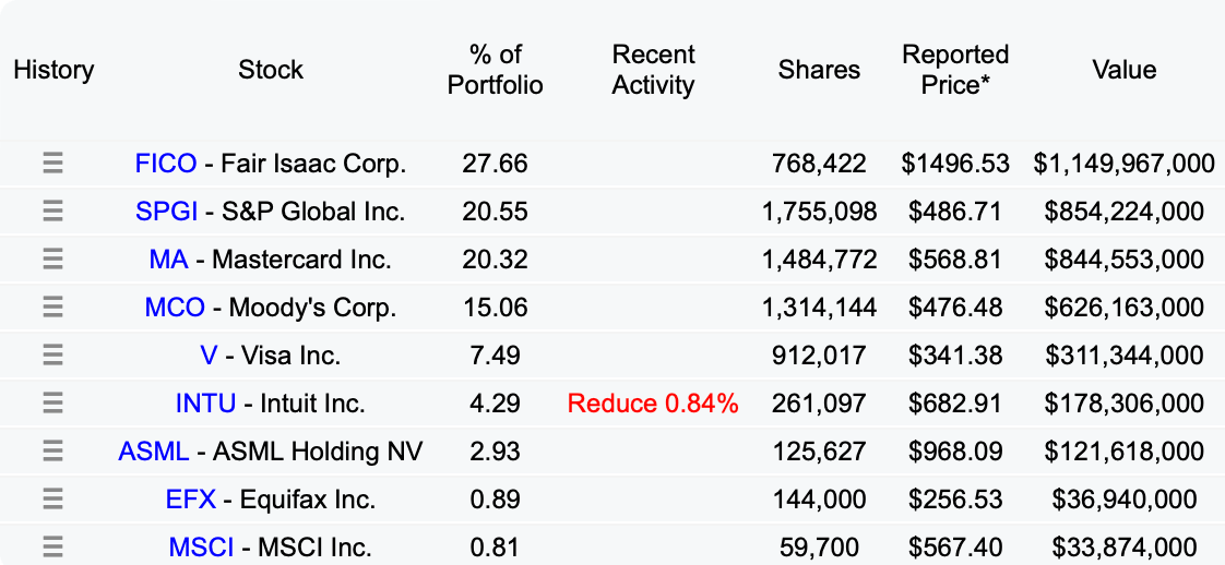 Ses principales positions, Mastercard, O'Reilly, Moody's, et Visa, illustrent cette approche. Ce sont des entreprises avec de solides Moat, des flux de trésorerie prévisibles et des perspectives de croissance stables. C’est d’ailleurs des dossiers que nous suivons régulièrement dans le Club Bourseko.