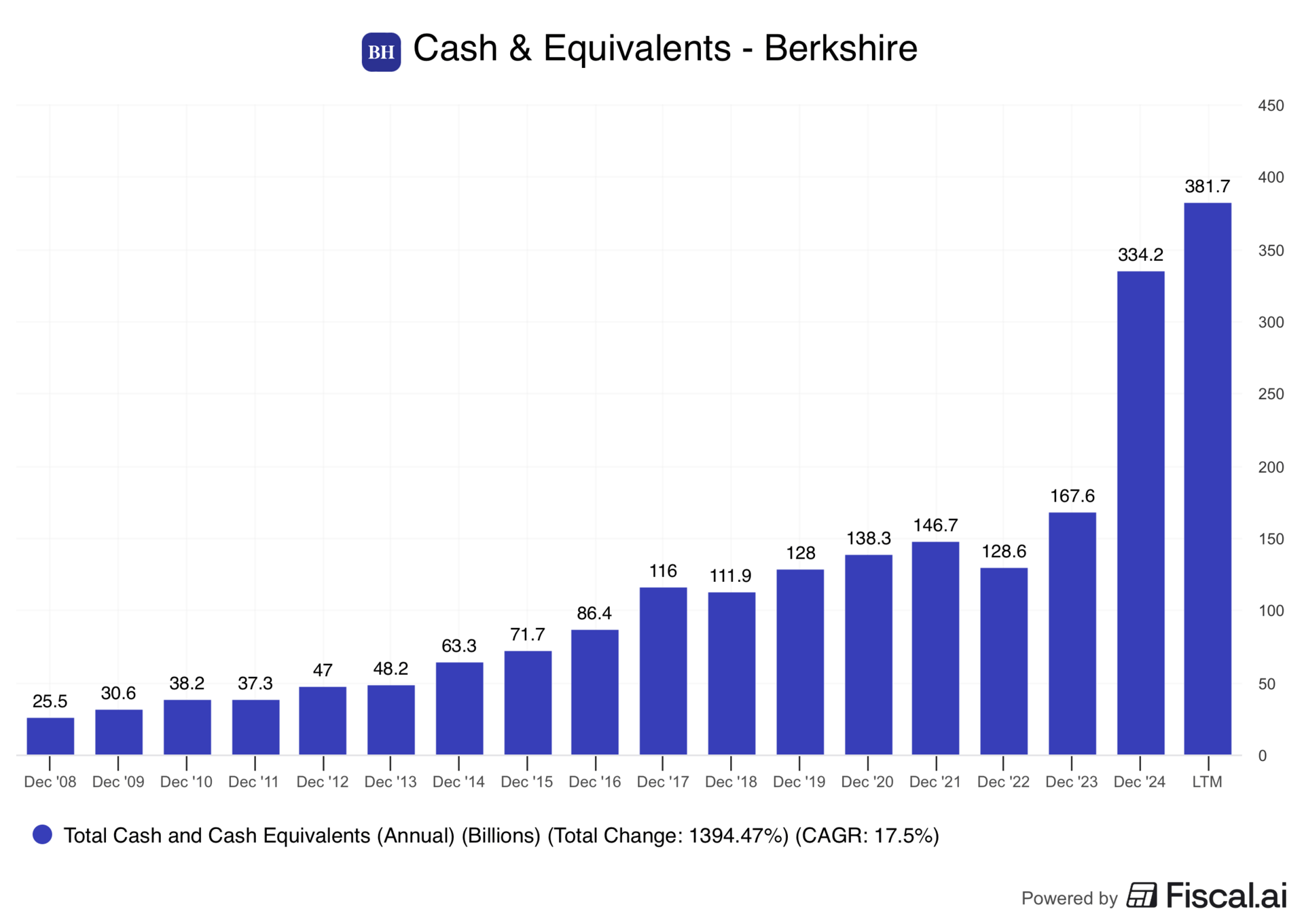 Depuis 2023, Berkshire a vu sa trésorerie exploser. Une grande partie est investie dans des bons du Trésor américain, nettement mieux rémunérés qu’il y a quelques années. Ainsi, à la fin du T3 2025, l’entreprise disposait de 381,7 milliards de dollars de liquidités. Un niveau tout simplement inédit.
