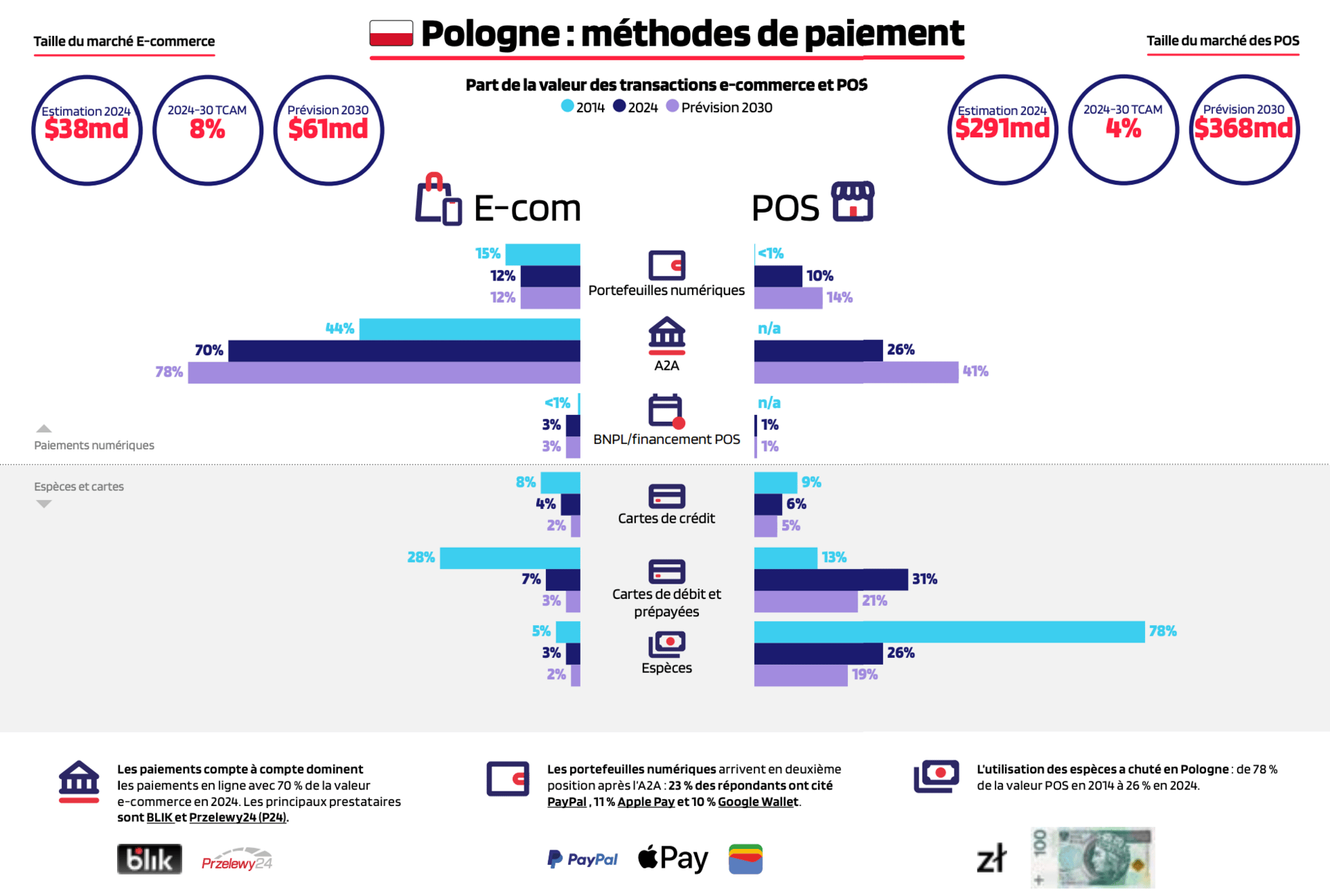 La France présente un profil intermédiaire, réparti entre espèces, cartes et paiements mobiles. La Pologne se démarque par l'importante adoption des paiements A2A qui constituent déjà 26% des transactions en commerce physique et devraient atteindre plus de 40% à l'horizon 2030.