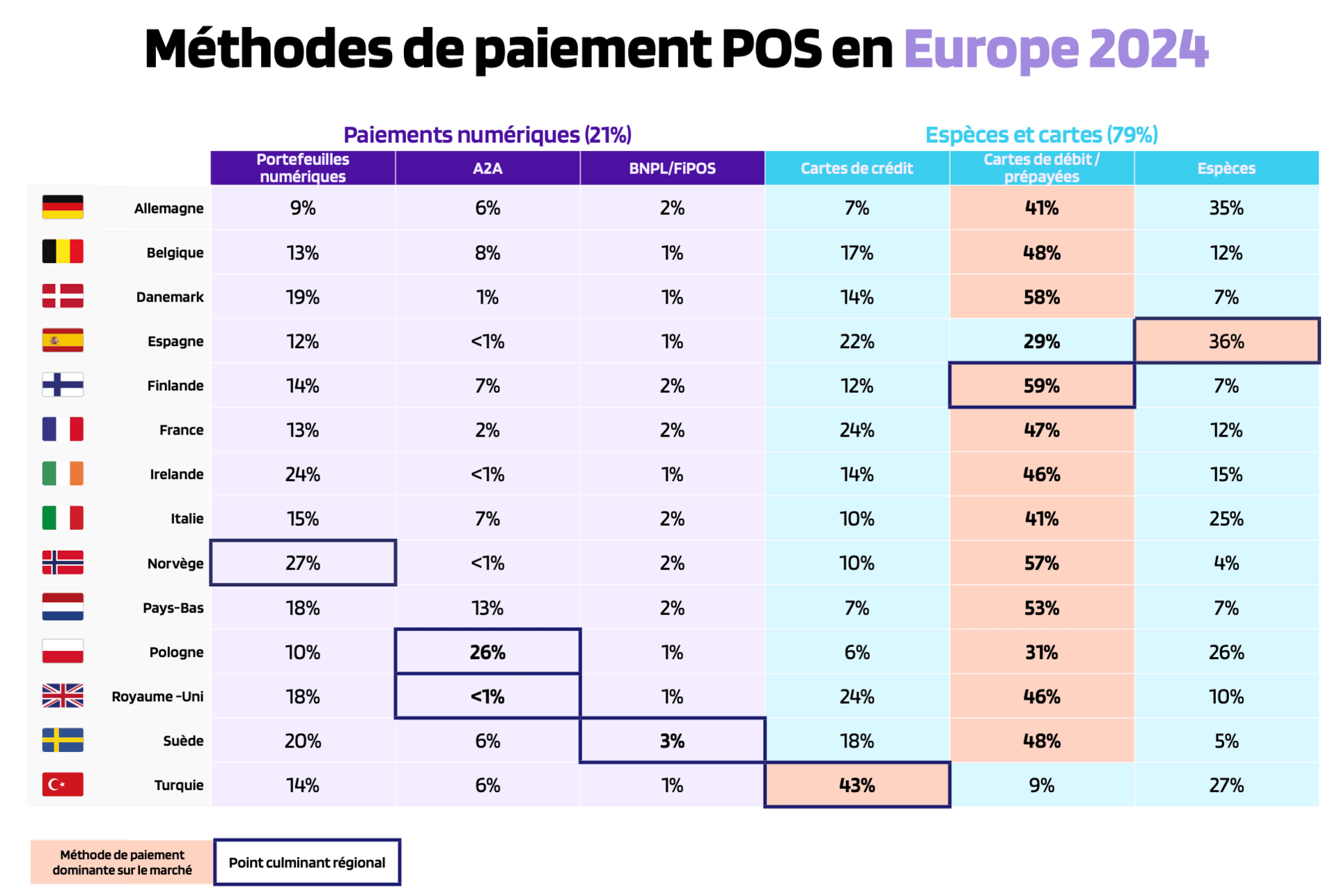 Le cas de l’Europe est intéressant, car les habitudes de paiement varient fortement d’un pays à l’autre. En effet, en 2024, les Allemands et les Espagnols restent les plus attachés au liquide pour les paiements physiques, tandis que les Scandinaves privilégient largement les cartes de débit.