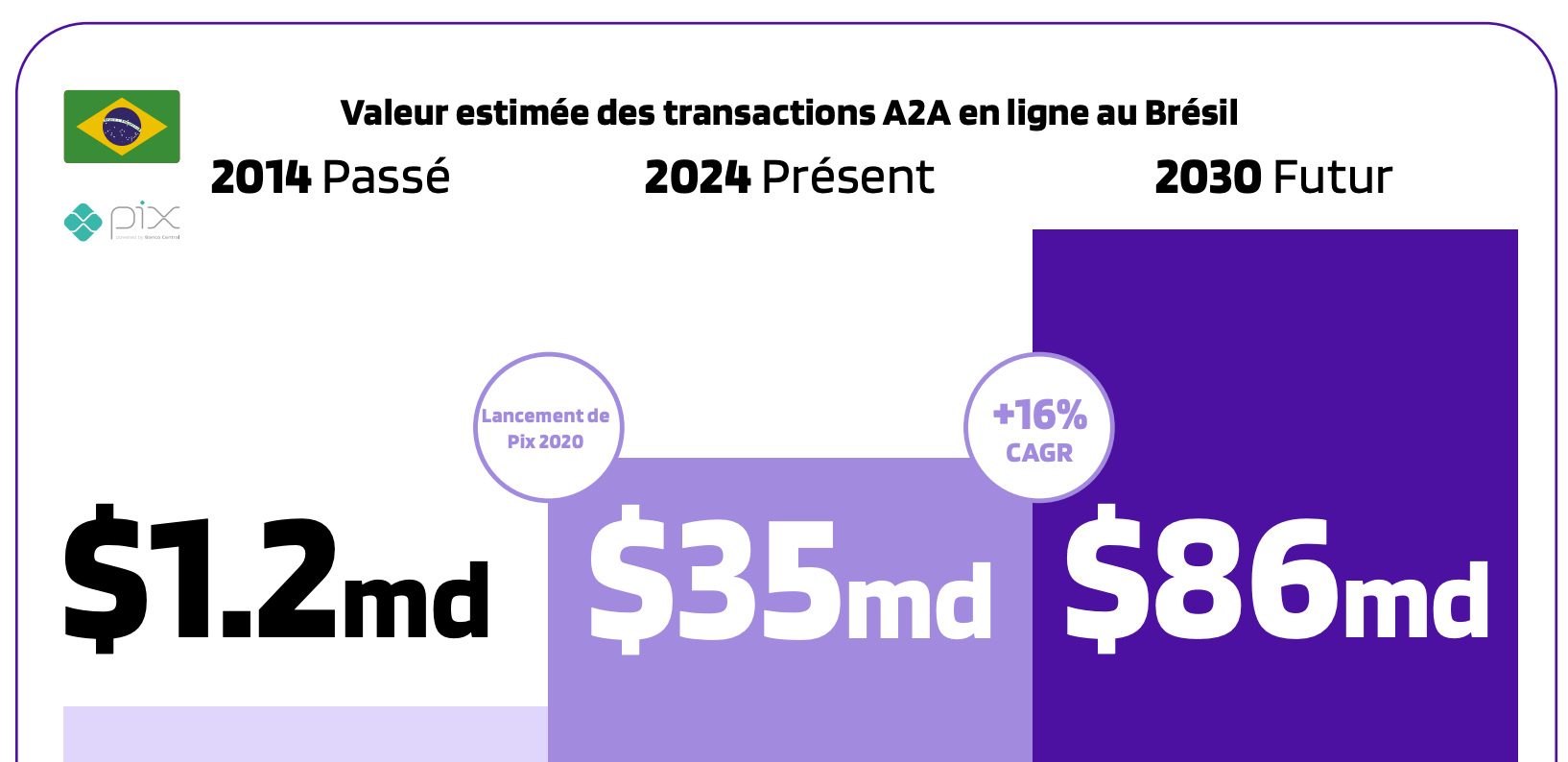 Pour comprendre la nature de la révolution, grâce à Pix, la valeur des paiements e-commerce A2A au Brésil est passée de 1 milliard $ en 2014 à 35 milliards $ en 2024 et devrait atteindre 86 milliards $ en 2030. Pix a dépassé les cartes pour les paiements en ligne et devrait également les surpasser en magasin dès 2025.