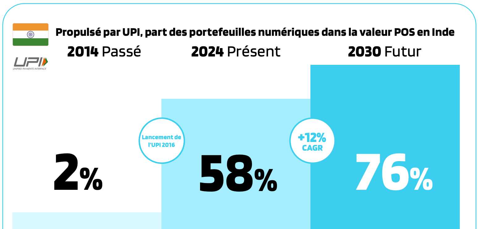 Et ça se traduit dans les chiffres de la part de l’UPI sur les transactions. En 2014, 2 ans avant le lancement de l’UPI, moins de 2% des paiements en magasin étaient faits avec un portefeuille numérique. Aujourd’hui, c’est 58% des transactions en magasin (ou vendeur de rue) et les estimations tablent sur 76% en 2030.