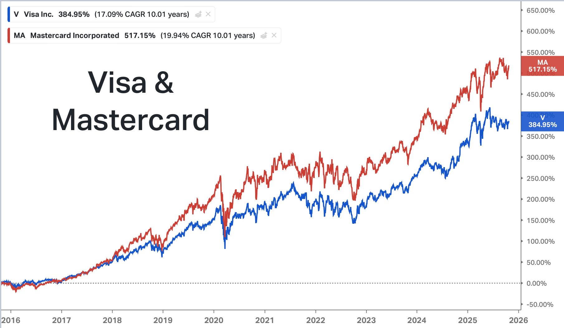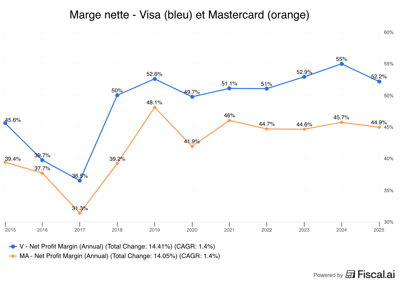 Pour beaucoup d’investisseurs (et nous en faisons partie) Visa et Mastercard font partie des entreprises les plus “belles” au monde. Leur avantage concurrentiel semble presque impossible à remettre en cause. Et ce n’est pas un hasard si ces deux géants affichent des marges nettes supérieures à 40%.